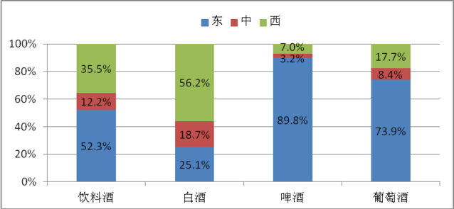 73.9%和89.8%的葡萄酒、啤酒在东部销售,这一比例在中部和西部分别是8.4%、3.2%和17.7%、7.0%。