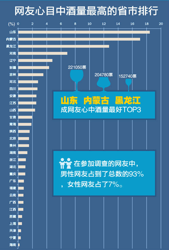 一般认为,北方比南方更能喝,山东、东北、内蒙、新疆、河南都有足够资格认为自己才是天下第一。有门户网站做过问卷调查,结果显示北方人酒量强于南方。