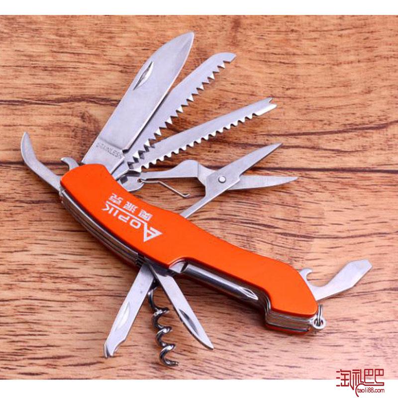功能说明:1.红酒开瓶器,2.钻孔器 3.十字改锥4.刀具 5.紧急切割安全带锯6.木锯 7.剪刀 8.开瓶器 9.启罐头器。