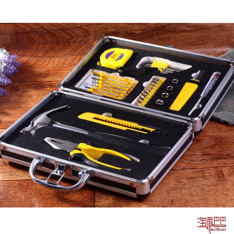 内六角5pc、螺批 10pc、手柄 1pc、卷尺 1pc套筒4pc、美工刀 1pc、羊角锤 1pc 、钢丝钳 1pc、测电笔 1pc 钟表批6pc、包装盒 1pc