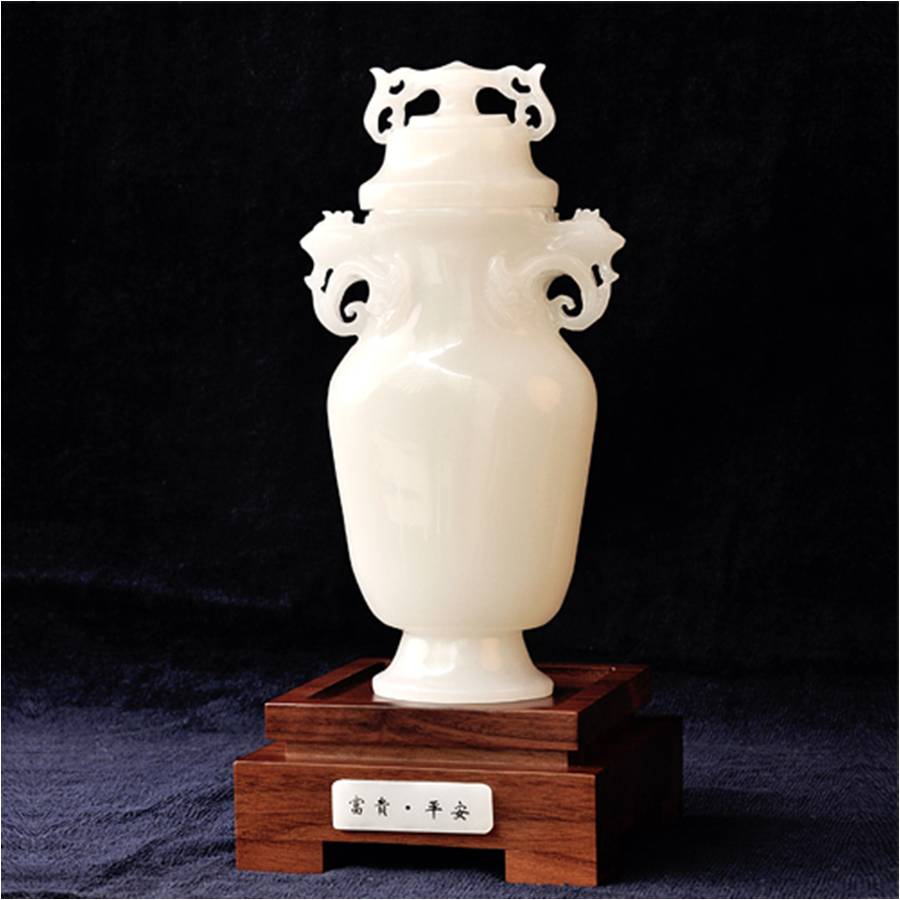 花瓶寓意一家平安吉祥、前程似锦、鸿运当头。白玉不但能美化人们的生活,陶冶性情,而且祛病保平安。玉雕的花瓶,高贵清新。可为您打开财富之门,赢得财源,助您事业昌盛,是玉石工艺品中桌面摆件或纪念收藏的佳品。