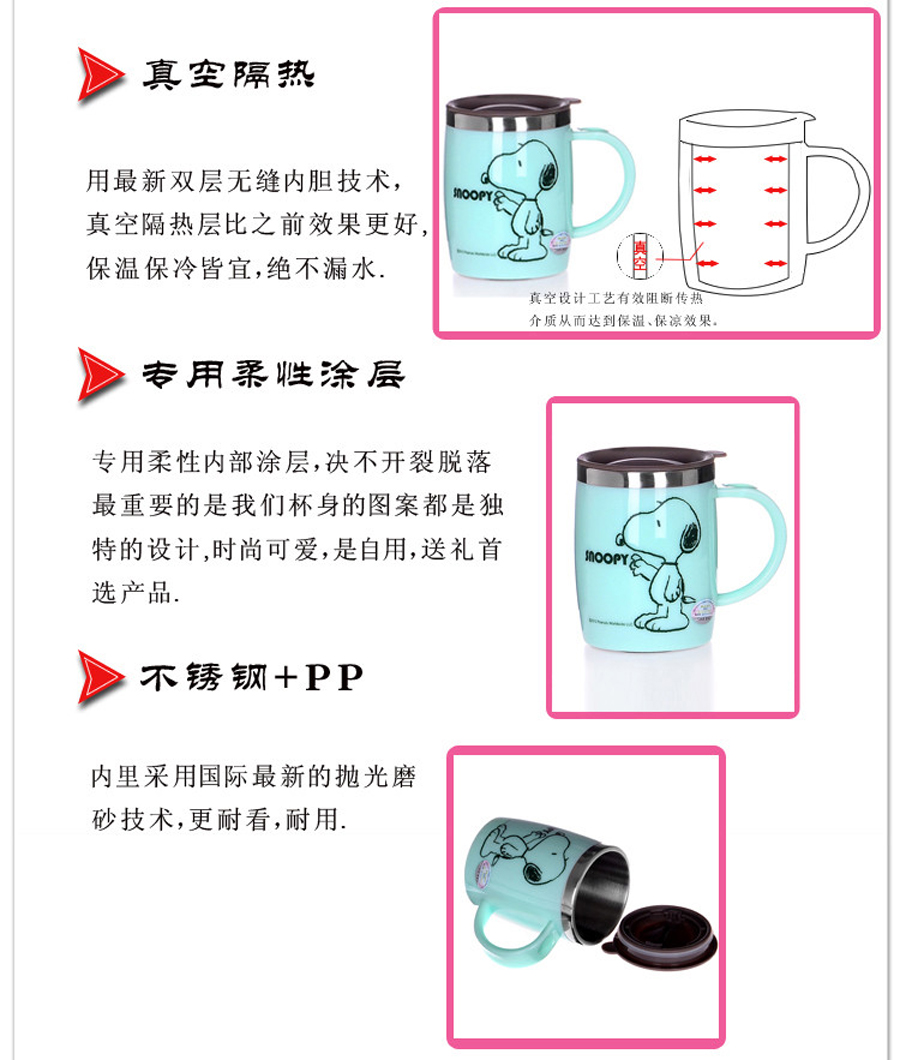 采用优质不锈钢材料,杯体内侧经抗菌加工工艺处理,表面光亮干净、卫生。采用国际流行外型,新颖美观,携用方便。外层不锈钢运用高科技高真空断热层,阻绝空气传热。