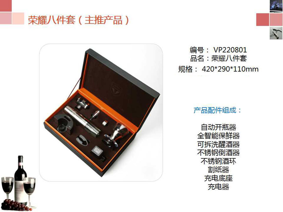 充电式电动开瓶器、抽真空酒塞、快速醒酒倒酒器、专用开纸刀、不锈钢酒环