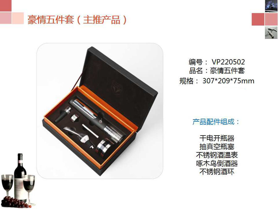充电式电动开瓶器、抽真空酒塞、快速醒酒倒酒器、专用开纸刀、不锈钢酒环