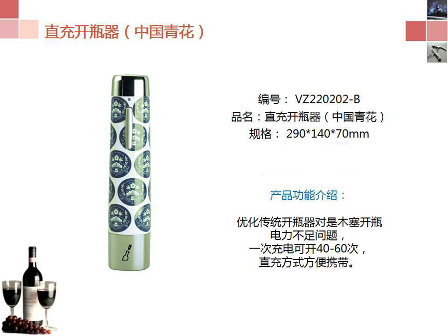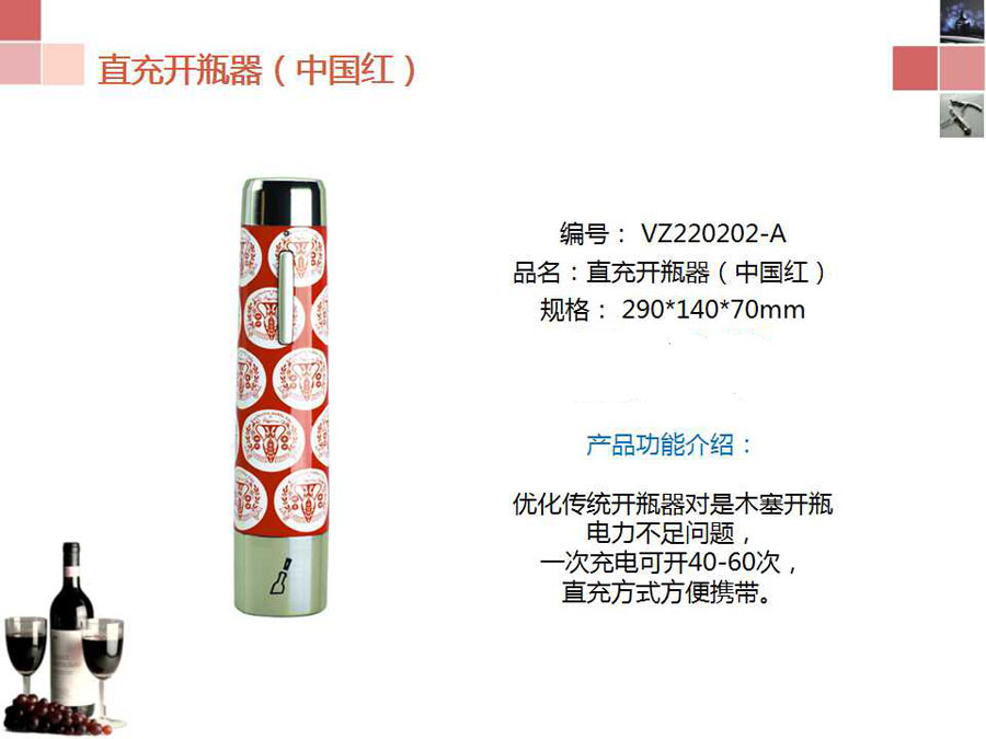 产品功能介绍:优化传统开瓶器对是木塞开瓶,电力不足问题,