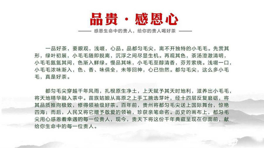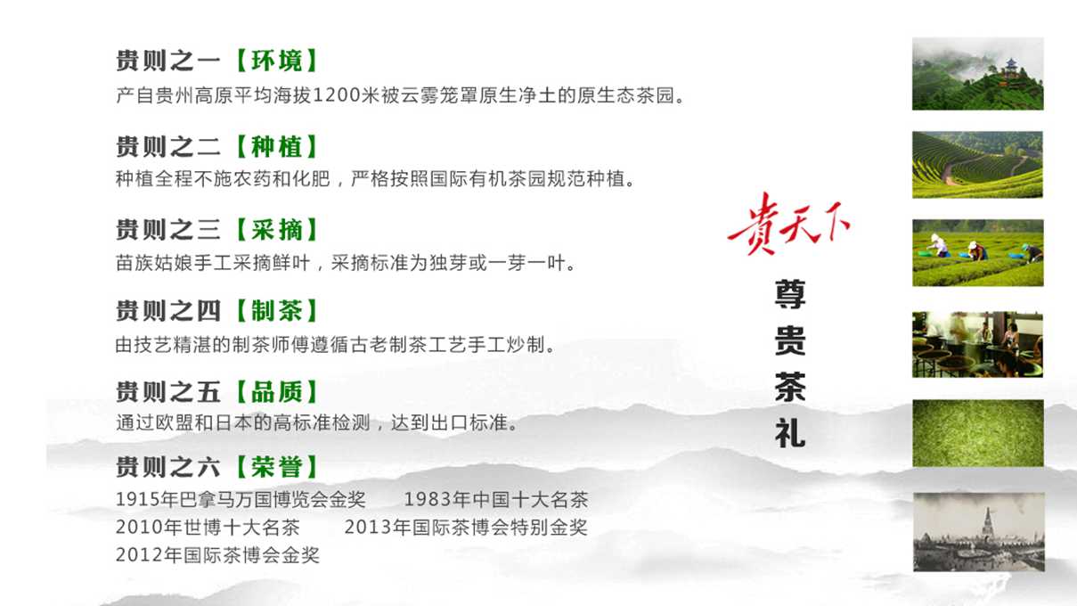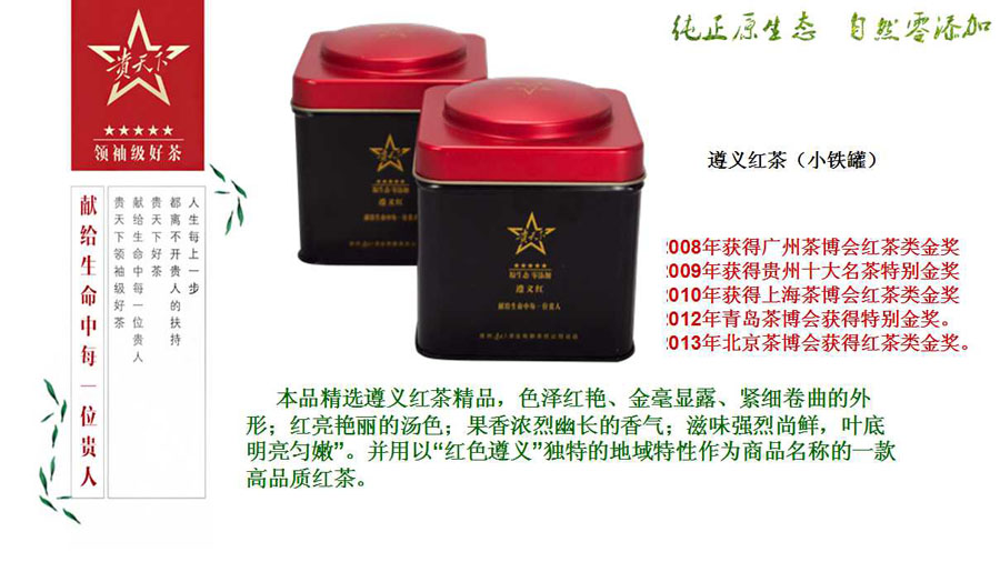 本品精选遵义红茶精品,色泽红艳、金毫显露、紧细卷曲的外形;红亮艳丽的汤色;果香浓烈幽长的香气;滋味强烈尚鲜,叶底明亮匀嫩”。并用以“红色遵义”独特的地域特性作为商品名称的一款高品质红茶。