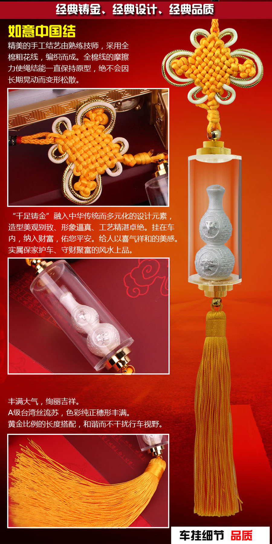关公以忠贞、守义、勇猛和武艺高强称著于世,他是万能神(结义之神、商业之神、勇武之神、伏魔之神),既可镇宅辟邪、保佑平安,也可招财进宝、财源广进。巧工铸金、细腻生动 ,A级流苏、丰满大气。装饰您的爱车,体现高贵品质。寄托祝福与期待,消灾避祸,迎福入身。以神灵福佑之力,护您一路平安,畅通无阻。