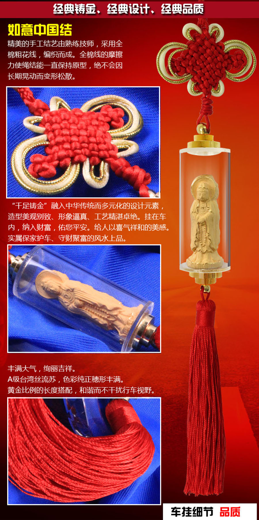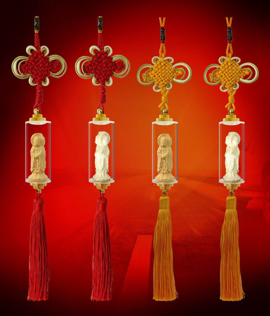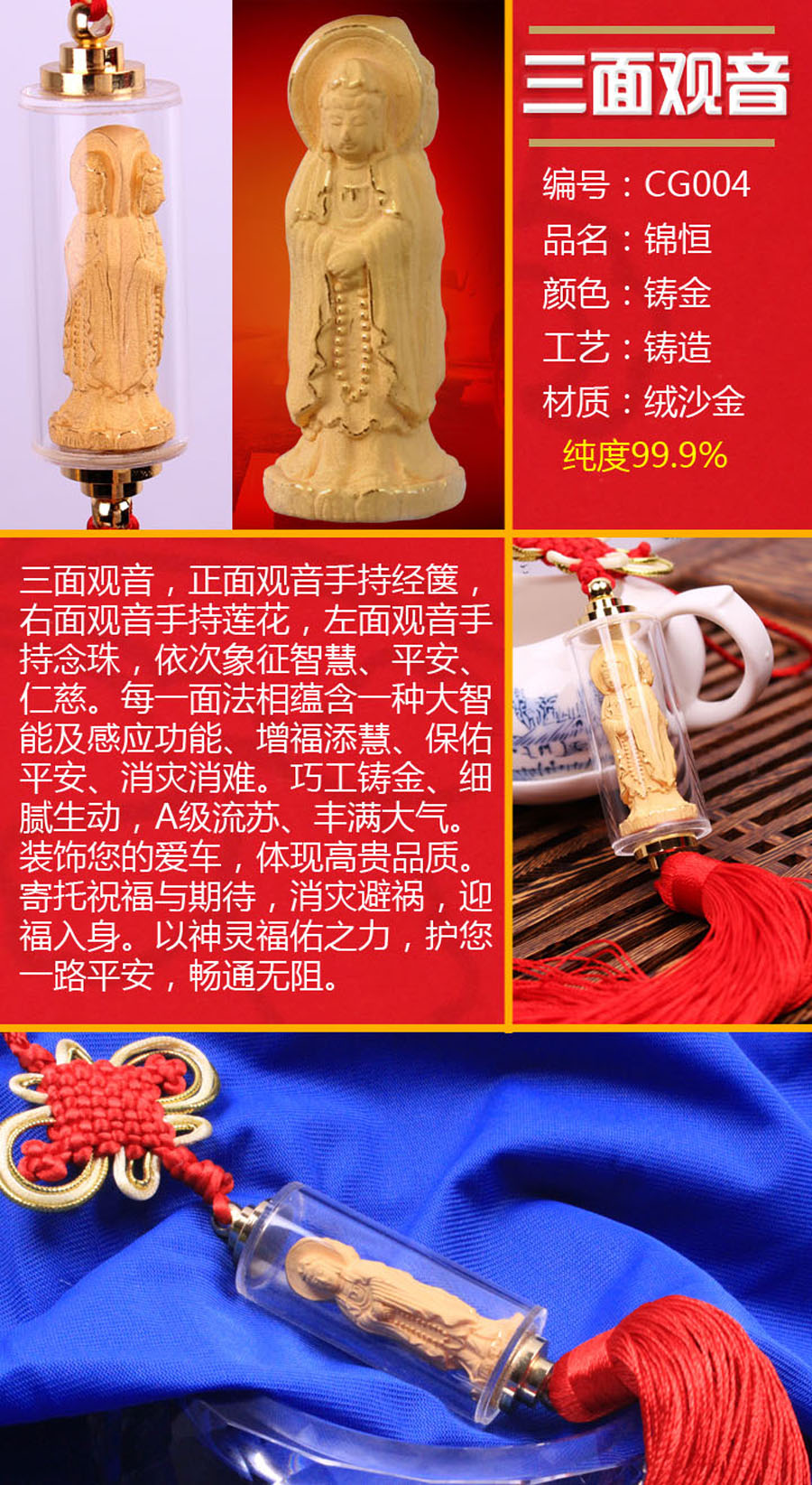 三面观音,正面观音手持经箧,右面观音手持莲花,左面观音手持念珠,依次象征智慧、平安、仁慈。每一面法相蕴含一种大智能及感应功能、增福添慧、保佑平安、消灾消难。巧工铸金、细腻生动,A级流苏、丰满大气。装饰您的爱车,体现高贵品质。寄托祝福与期待,消灾避祸,迎福入身。以神灵福佑之力,护您一路平安,畅通无阻。